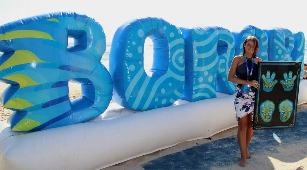 I attended the official launch of Borobi the 2018 Gold Coast Commonwealth Games Mascot. My artwork and story have been used for the Indigenous markings on Borobi, his surfboard, name and advertising signage in the lead up to the 2018 Commonwealth Games. He will play a major part during the Commonwealth Games and as he walks around the Gold Coast he leaves my story of the Commonwealth Games behind him in the sand.
