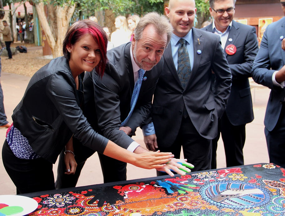 Launch of Reconciliation Week 2015 at Dreamworld on the Gold Coast. I painted a large painting and had dignitaries place their handprints on the painting which will hang in the GOLDOC office in the lead up to the 2018 Commonwealth Games. The painting tells of significant movements forward for Aboriginal people in Australia and it was a reminder for the dignitaries that placed their handprints on the painting of GOLDOCS commitment to have reconciliation Action Plan for the 2018 Commonwealth Games.