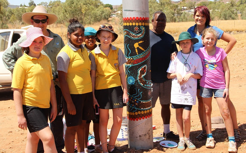 Painting power poles at Tharrapatha Way in Mount Isa which is a cultural walking trail. Tharrapatha in the Kalkadoon language means Leichhardt River and this river is part of a Kalkatungu dreaming story. The 2nd pole was painted with students from Cloncurry State Primary School.