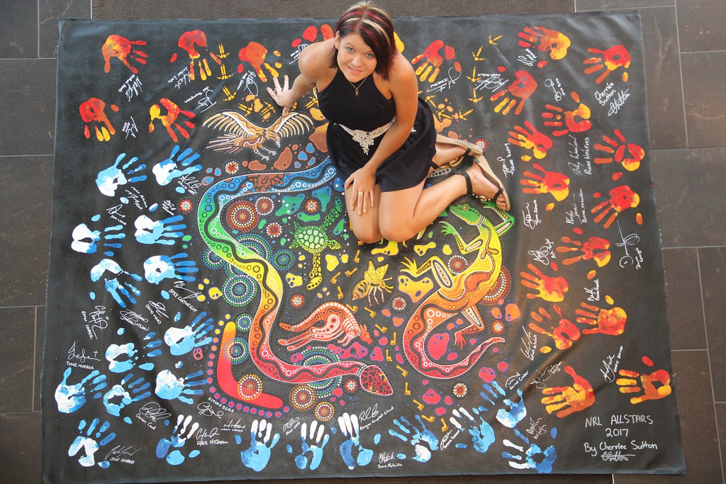 NRL's All Stars Week in Newcastle where I painted the centrepiece of a large painting and then the World All Stars and the Indigenous All Stars teams and squad members signed and placed their handprints on the painting. The painting was sold and raised $5,000.00 which was donated to the Preston Campbell Foundation.