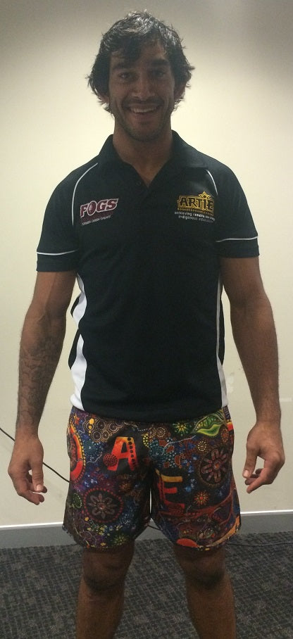 Indigenous Rugby League Legend Johnathon Thurston wearing the first set of board shorts produced by the A.R.T.I.E. team from my painting that was donated to them.