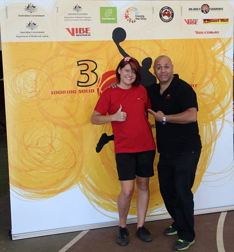 Role model and artist teaching school children painting techniques at Deadly Vibe's 3on3 basketball and hip hop challenge in Bundaberg with fellow artist and comedian Kevin Kropinyeri.