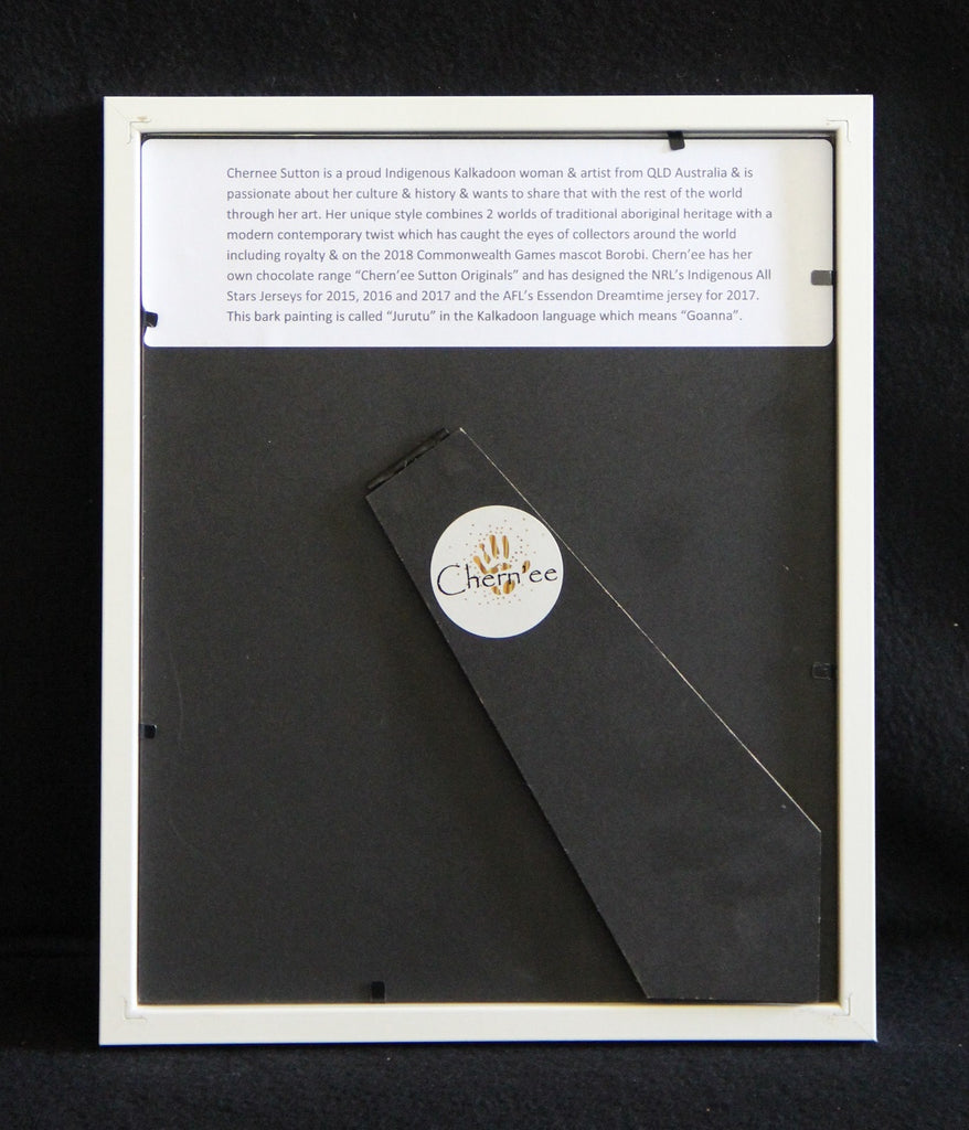 This beautiful framed original canvas bark painting by Aboriginal artist Chern'ee Sutton makes the perfect gift. This desktop frame measures 27cm x 22cm with the artwork protected behind glass and signed by the artist. This piece is called Utinat in the Kalkadoon language which means emu.