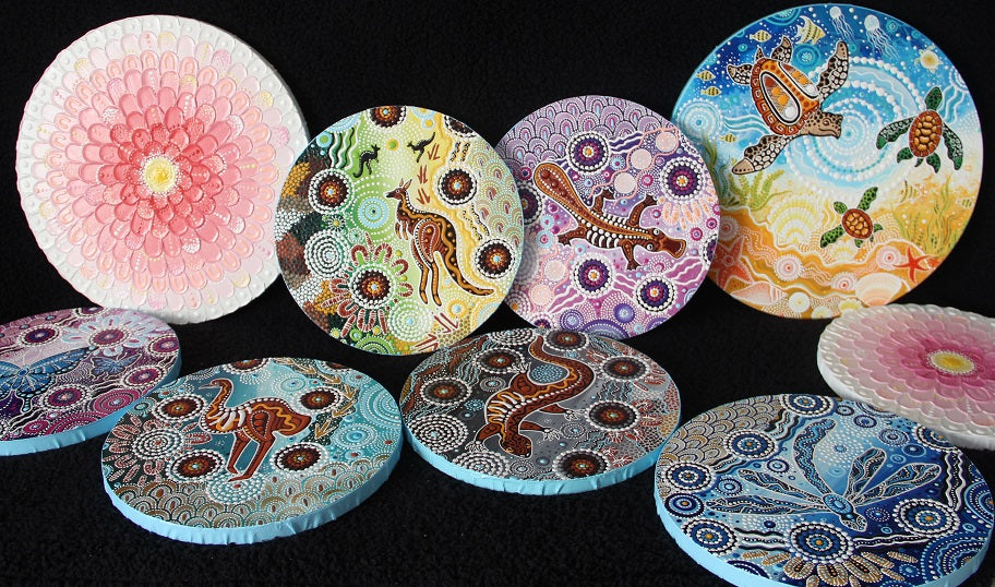 These beautiful original round canvas paintings by Aboriginal artists Chern'ee, Brooke and Jesse Sutton make the perfect gift. The artwork is stretched onto a round wooden frame and postage is free Australia wide, International customers, please email for a postage price with your address and country.