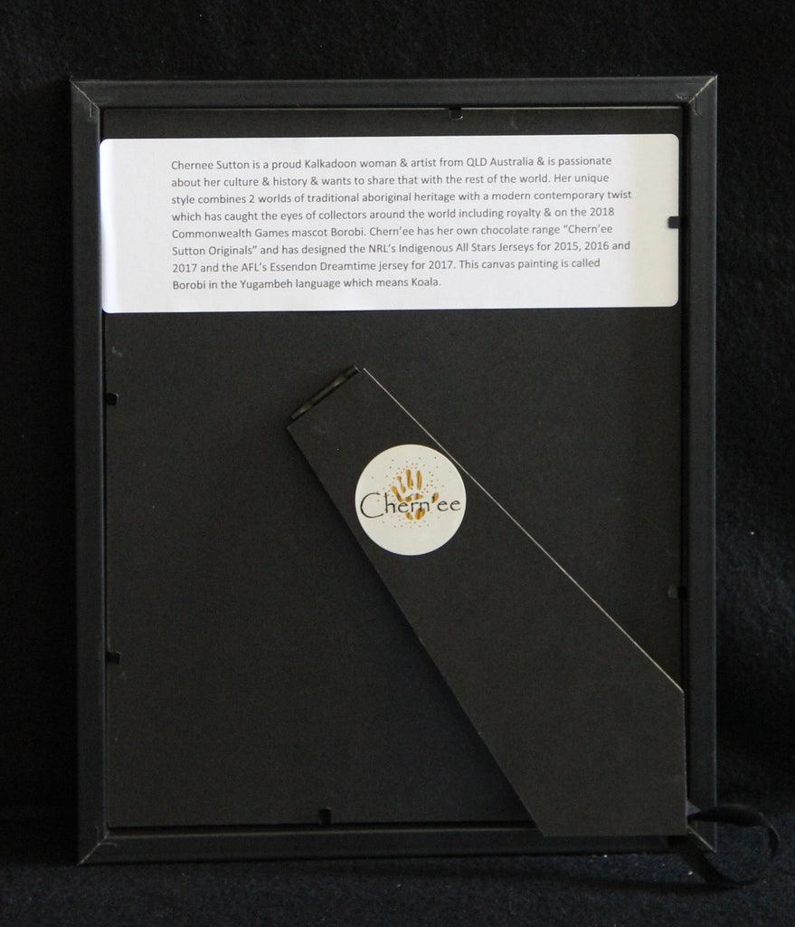 This beautiful framed original canvas painting by Aboriginal artist Chern'ee Sutton makes the perfect gift. These frames can be either desktop or hung and measure 38cm x 30cm with the artwork protected behind glass and signed by the artist. This piece is called Jurutu in the Kalkadoon language which means Goanna.