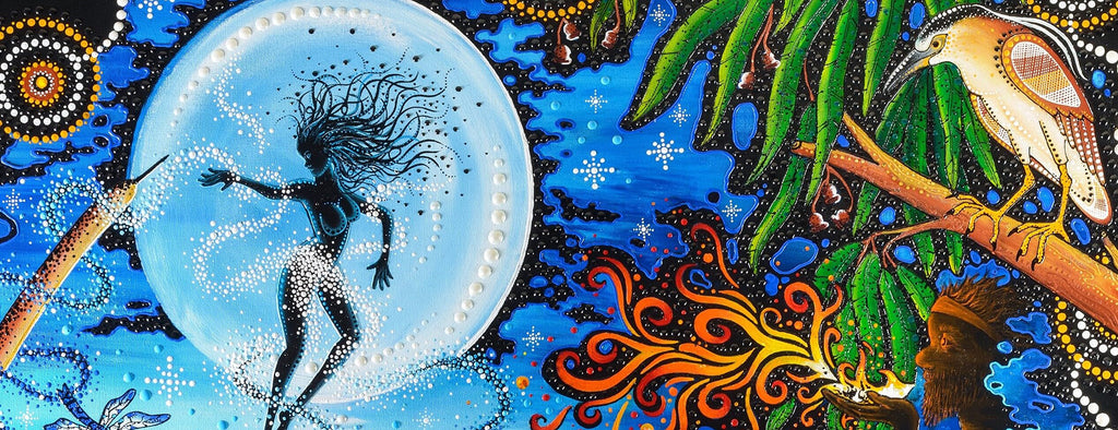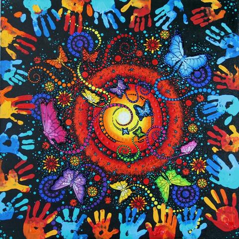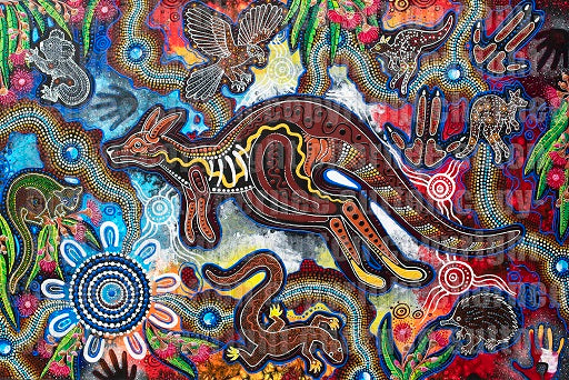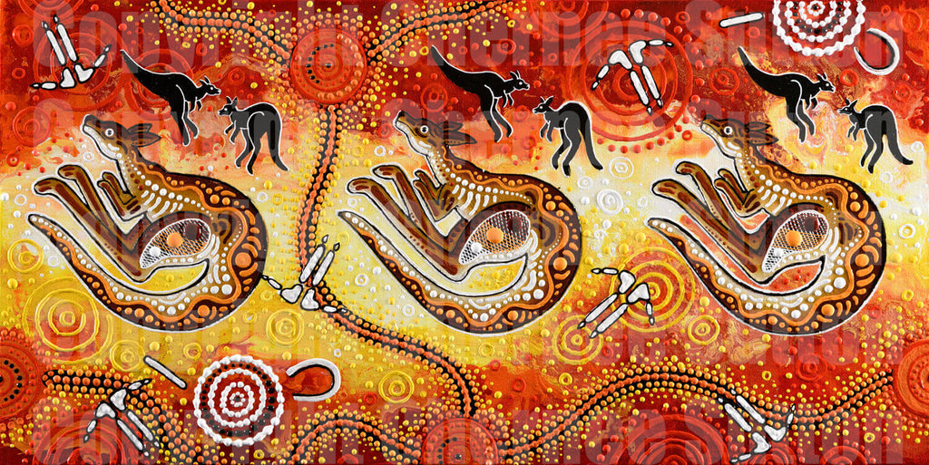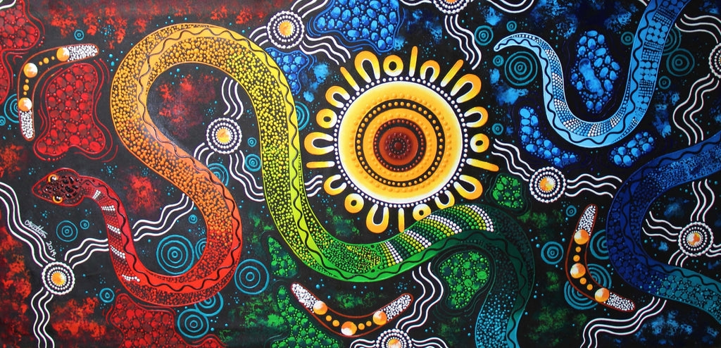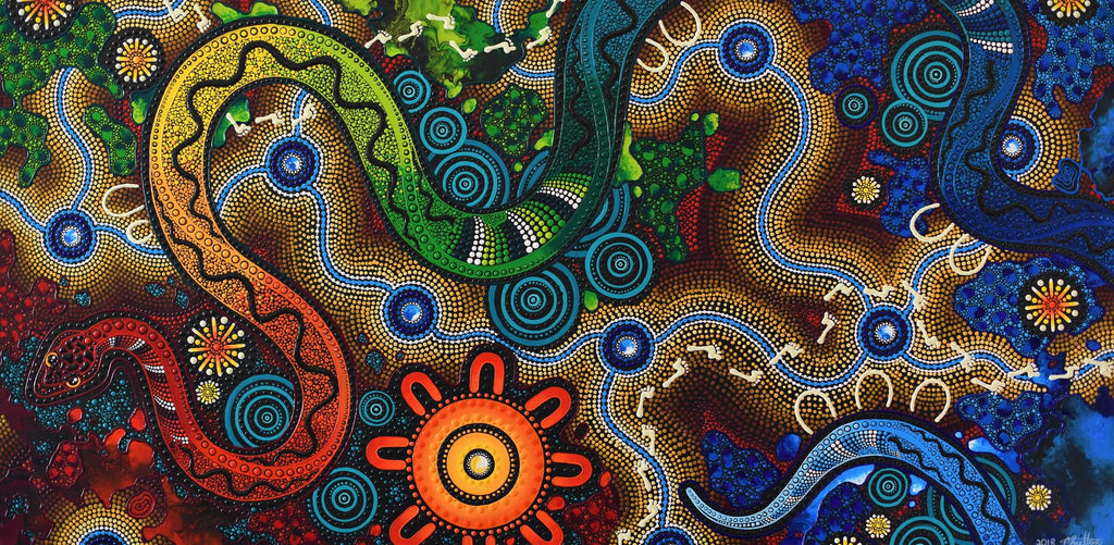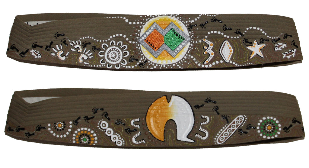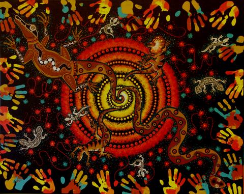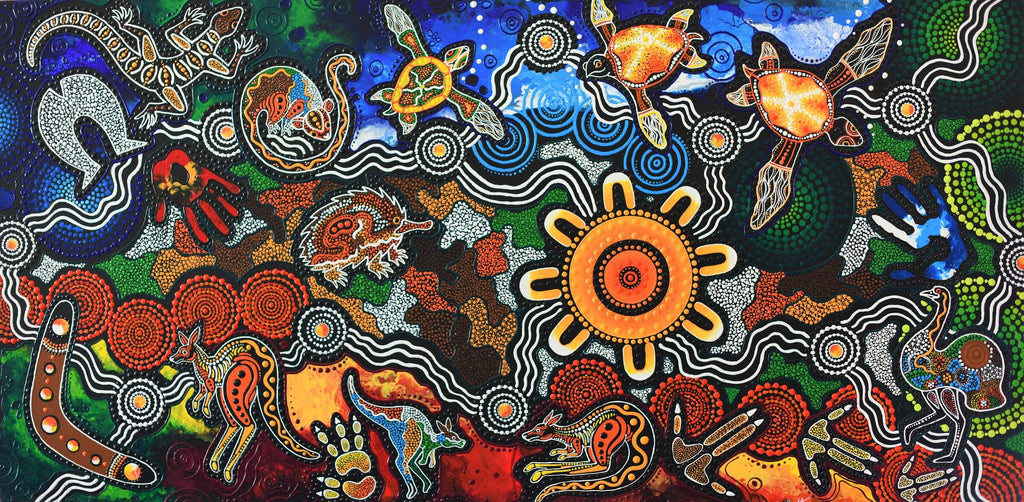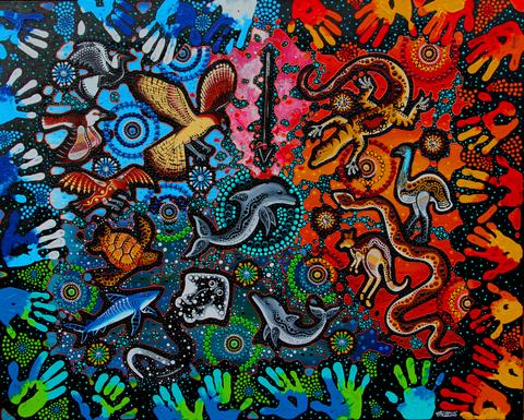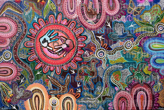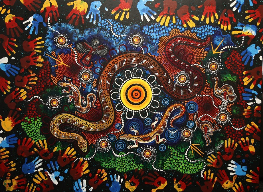 With permission from the Yugambeh Language group I painted the creation story of the Gold Coast and had elders and Yugambeh champions place their handprints around the painting which has been gifted to the Yugambeh museum