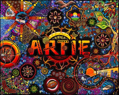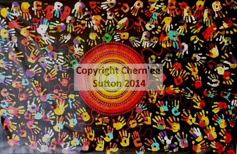 Banner donated to the A.R.T.I.E. program (Achieving Results Through Indigenous Education). Handprints are from the A.R.T.I.E. students at the 2014 Arthur Beetson Fun Day and also Tahan from Big brother 2014