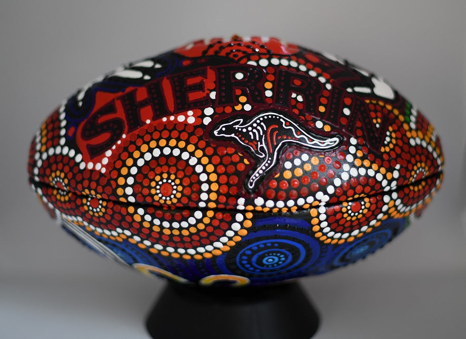 Painted Sherrin football donated to the Adam Goodes and Mick O'Loughlin's GO Foundation Fundraiser.